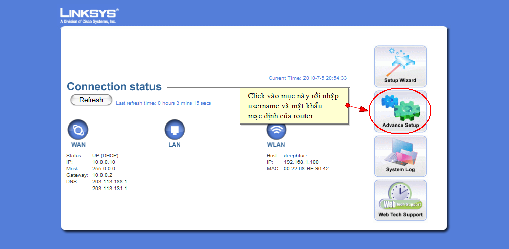 192.168.1.1 ( IP của Wireless router ) , chọn mục Advanced Setup rồi nhập Username và Mật khẩu mặc định của Wireless router