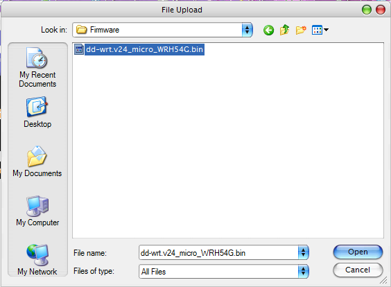 Bước 6: Bấm Browse… mở chọn file Firmware lúc nãy bạn download về từ trang www.dd-wrt.com