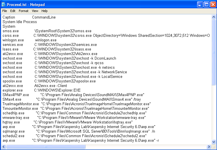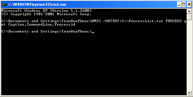 WMIC /OUTPUT:C:\ProcessList.txt PROCESS get Caption,CommandLine,Processid